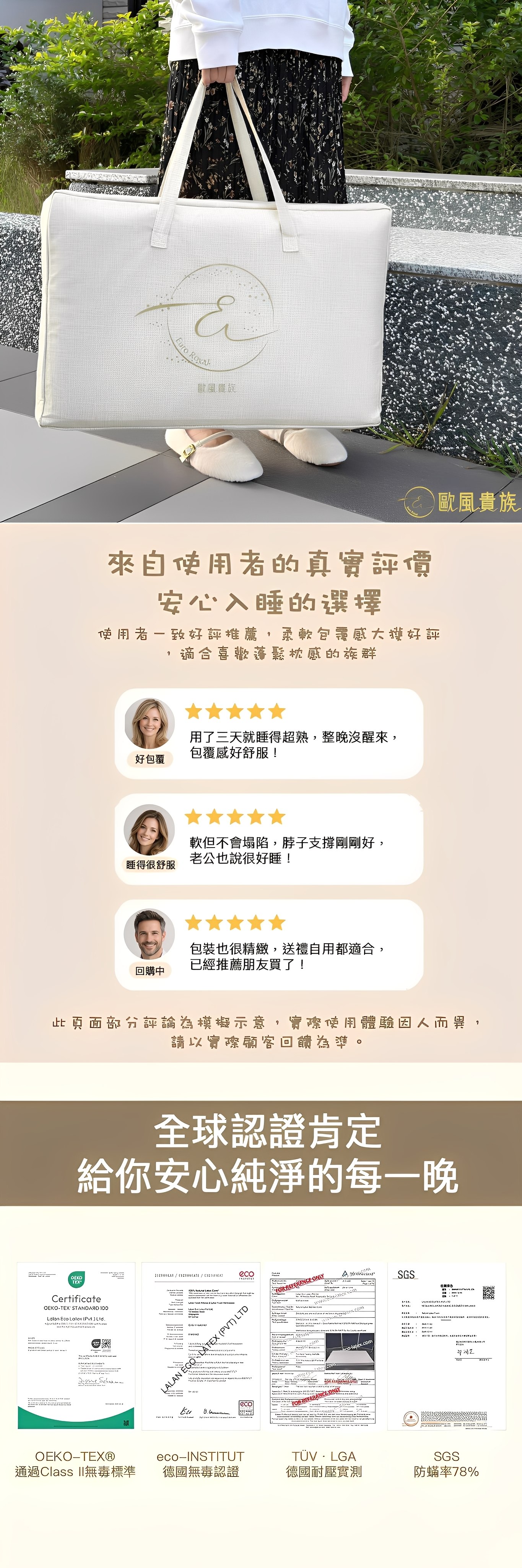 專為亞洲人體型打造的歐風貴族工學乳膠枕,採用來自斯里蘭卡的天然乳膠,純度高達94%,通過SGS與德國 TÜV Rheinland(LGA)雙重檢驗。枕型結構設計符合人體工學,三區分壓配置能精準支撐頭、頸、肩,協助穩定翻身頻率、減少晨間僵硬,幫助進入深層睡眠。