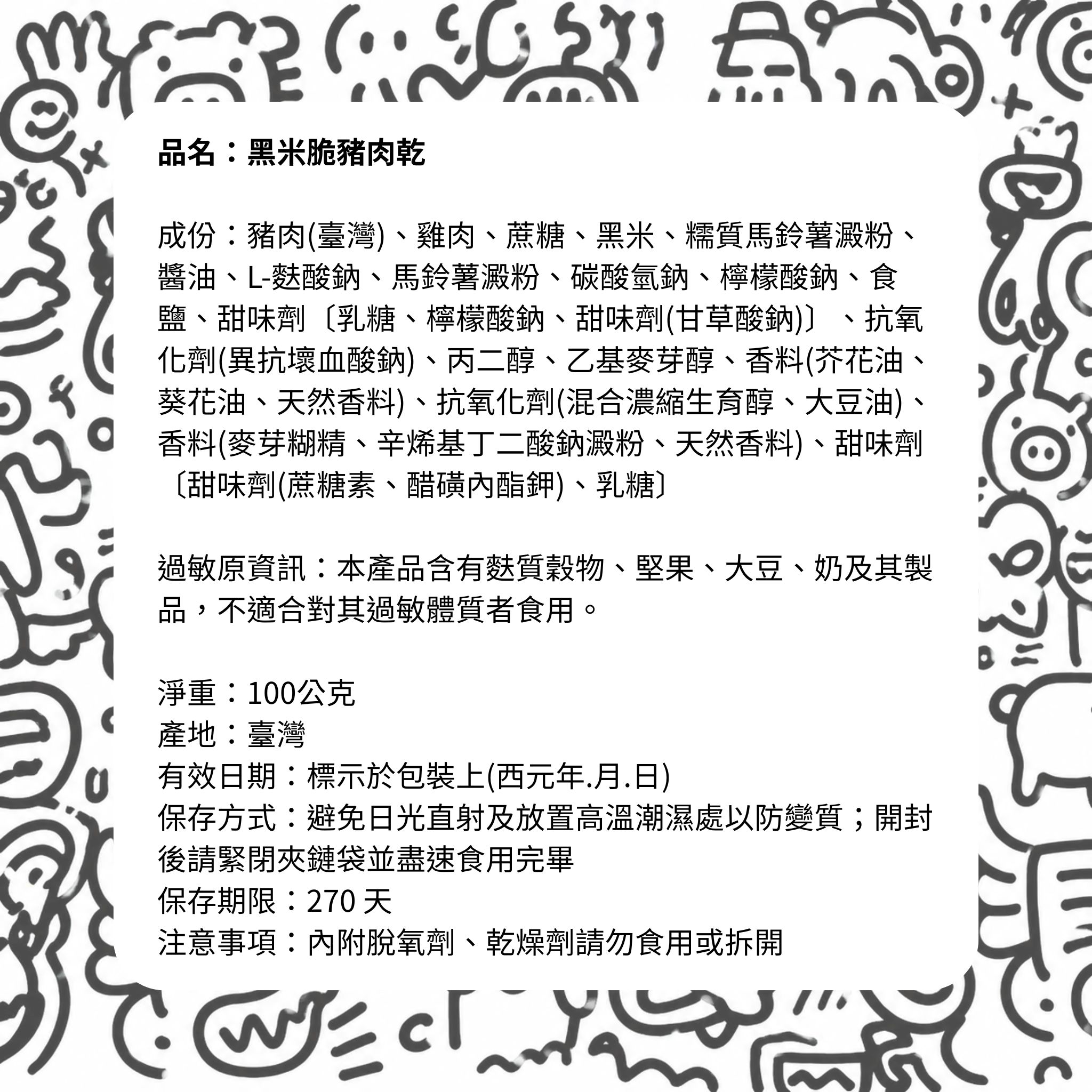成份:豬肉(臺灣)、雞肉、蔗糖、黑米、糯質馬鈴薯澱粉、醬油、L-麩酸鈉、馬鈴薯澱粉、碳酸氫鈉、檸檬酸鈉、食鹽、甜味劑〔乳糖、檸檬酸鈉、甜味劑(甘草酸鈉)〕、抗氧化劑(異抗壞血酸鈉)、丙二醇、乙基麥芽醇、香料(芥花油、葵花油、天然香料)、抗氧化劑(混合濃縮生育醇、大豆油)、香料(麥芽糊精、辛烯基丁二酸鈉澱粉、天然香料)、甜味劑〔甜味劑(蔗糖素、醋磺內酯鉀)、乳糖〕