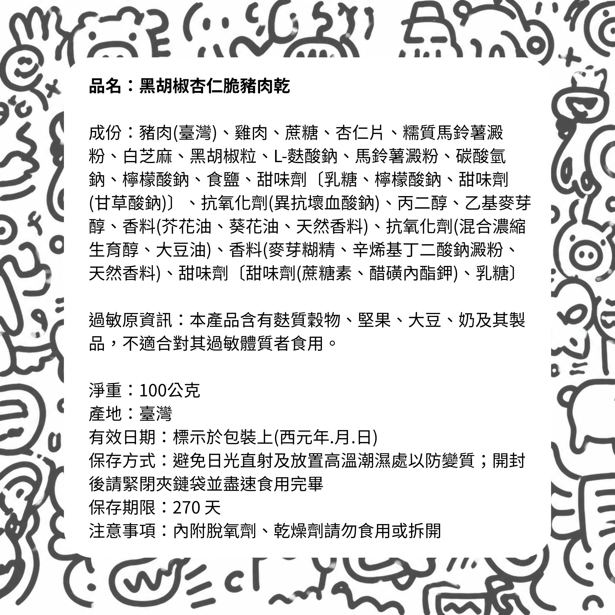 成份:豬肉(臺灣)、雞肉、蔗糖、杏仁片、糯質馬鈴薯澱粉、白芝麻、黑胡椒粒、L-麩酸鈉、馬鈴薯澱粉、碳酸氫鈉、檸檬酸鈉、食鹽、甜味劑〔乳糖、檸檬酸鈉、甜味劑(甘草酸鈉)〕、抗氧化劑(異抗壞血酸鈉)、丙二醇、乙基麥芽醇、香料(芥花油、葵花油、天然香料)、抗氧化劑(混合濃縮生育醇、大豆油)、香料(麥芽糊精、辛烯基丁二酸鈉澱粉、天然香料)、甜味劑〔甜味劑(蔗糖素、醋磺內酯鉀)、乳糖〕